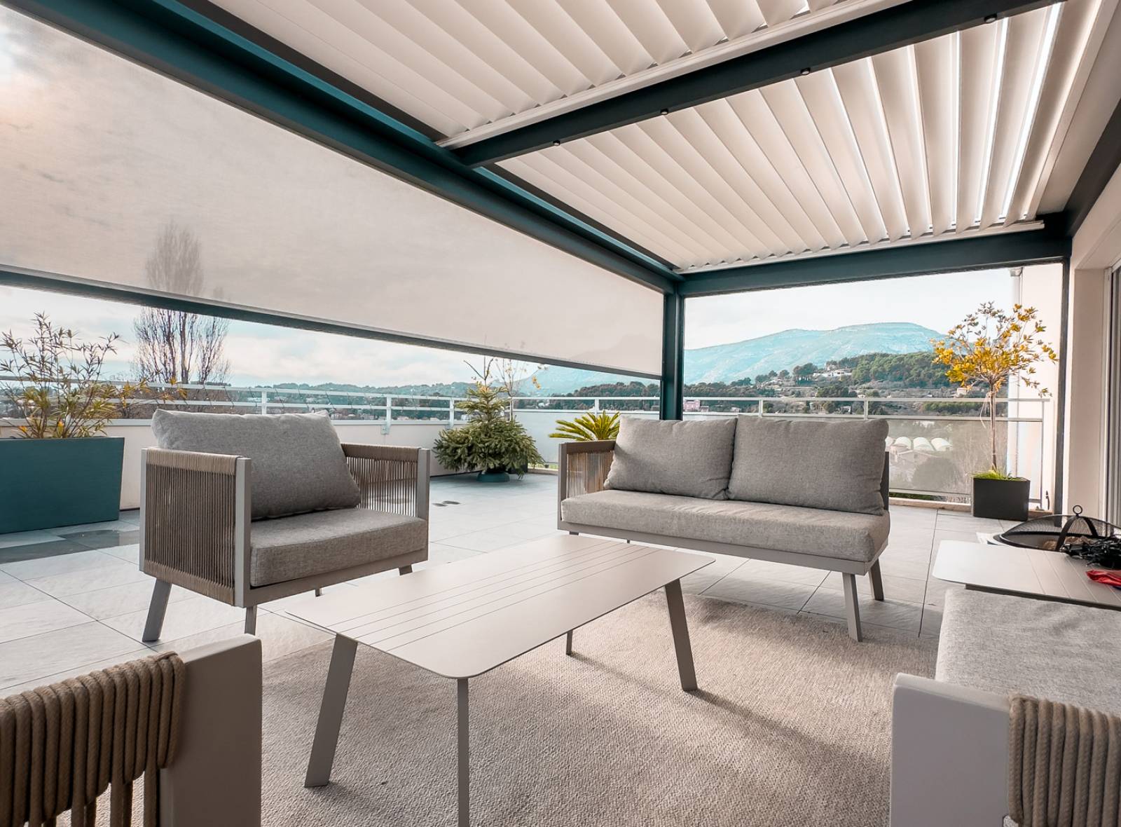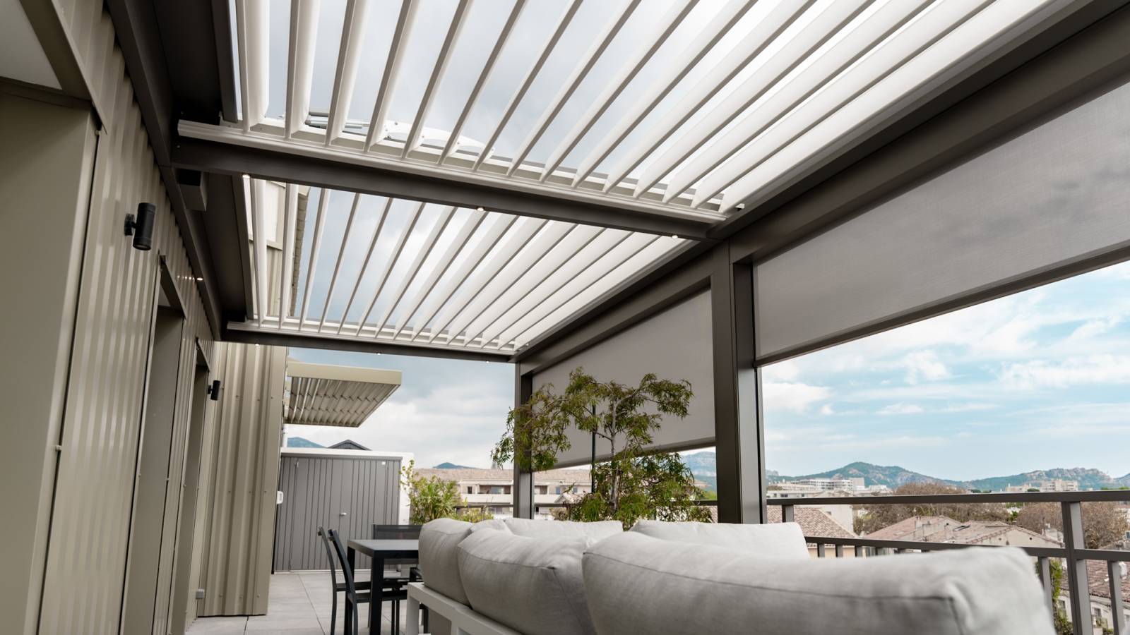 Les lames orientables motorisées permettent d’adapter votre environnement au fil de la journée et des saisons, transformant votre extérieur en véritable pièce de vie, conviviale et élégante, été comme hiver.