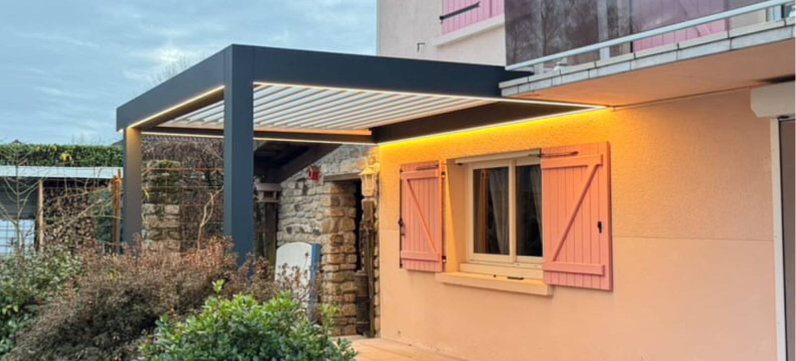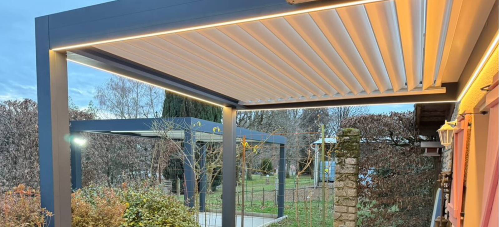 À Limoges, notre entreprise a réalisé l’installation d’une pergola bioclimatique 5×3 mètres en RAL 7016, équipée de rubans LED intégrés, offrant un espace extérieur moderne, élégant et parfaitement adapté à une utilisation de jour comme de nuit.