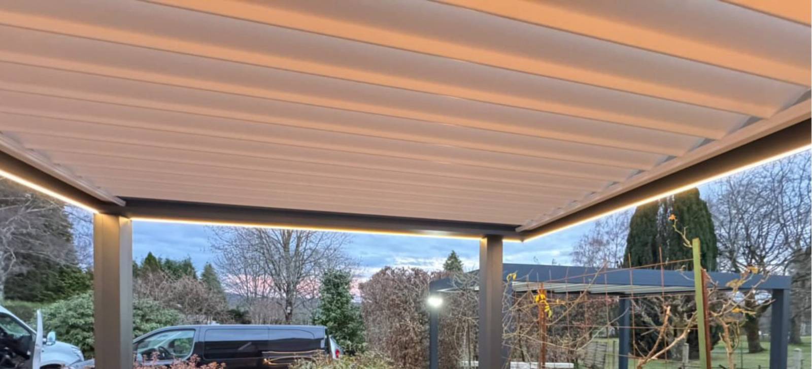 L’un des éléments clés de cette installation est l’intégration de rubans LED directement dans la structure de la pergola. Discrets et parfaitement intégrés, ils diffusent une lumière douce et homogène qui met en valeur les lignes de la pergola. Cet éclairage crée une atmosphère chaleureuse et raffinée, idéale pour les soirées en terrasse, les repas en extérieur ou les moments de détente. Les rubans LED permettent de prolonger l’utilisation de la pergola bien après la tombée de la nuit, transformant l’espace en un véritable lieu de vie.