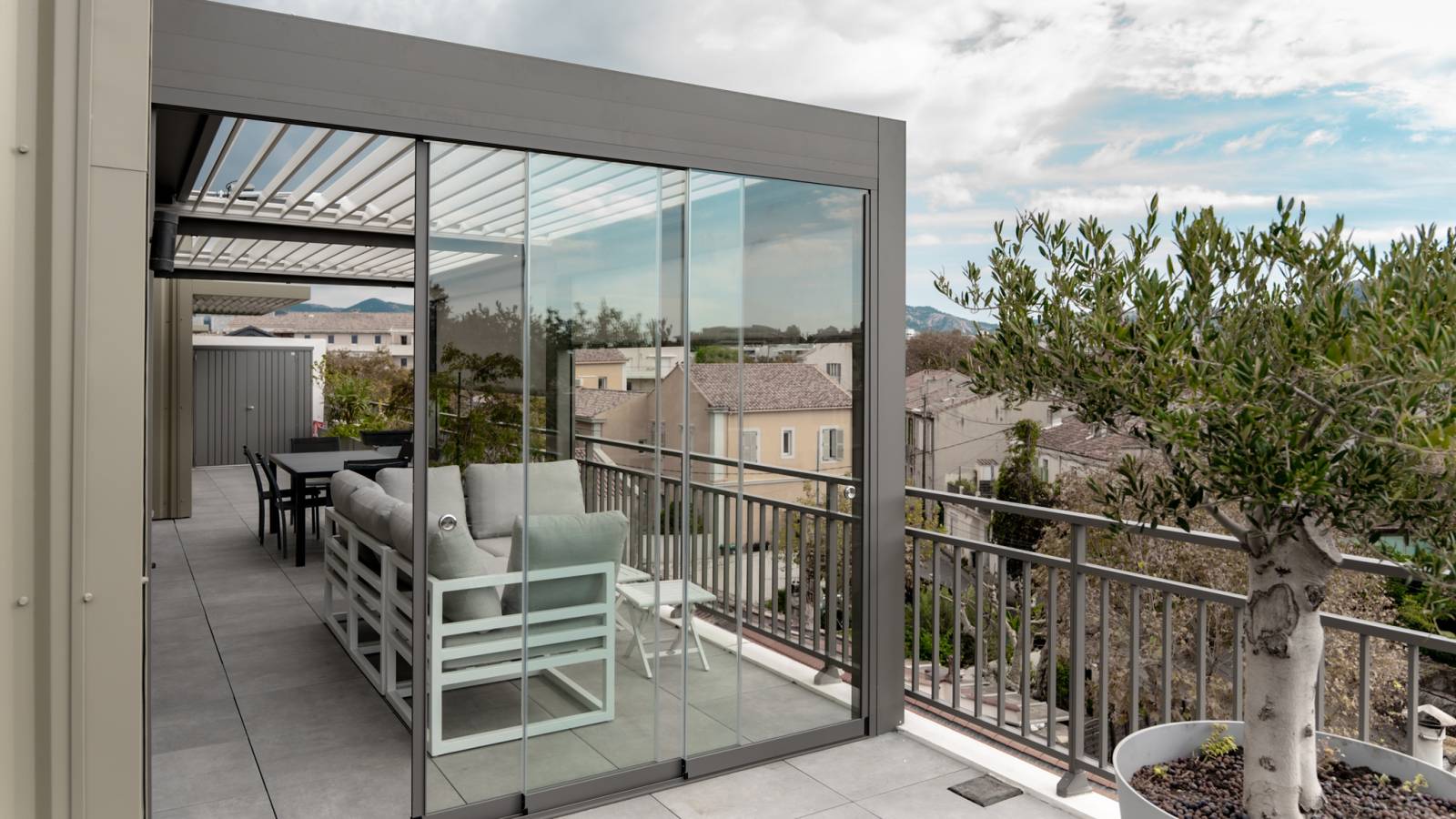 En plus d’être totalement étanche, la pergola bioclimatique peut être équipée de nombreuses options pour maximiser votre confort. L’ajout de stores ZIP motorisés, de rideaux de verre ou d’un éclairage LED permet de créer un véritable espace de vie extérieur, utilisable même en cas de pluie ou de vent.
